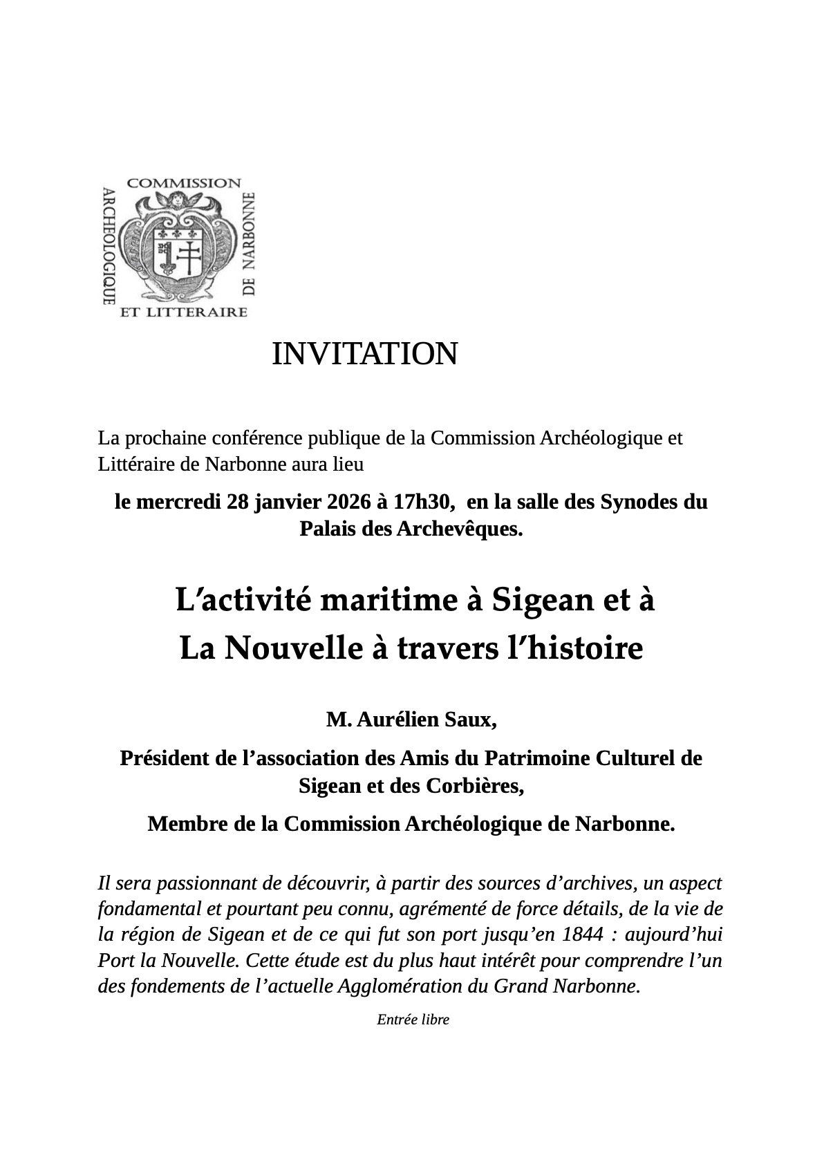 La Commission Archéologique et Littéraire de Narbonne vous invite à sa conférence