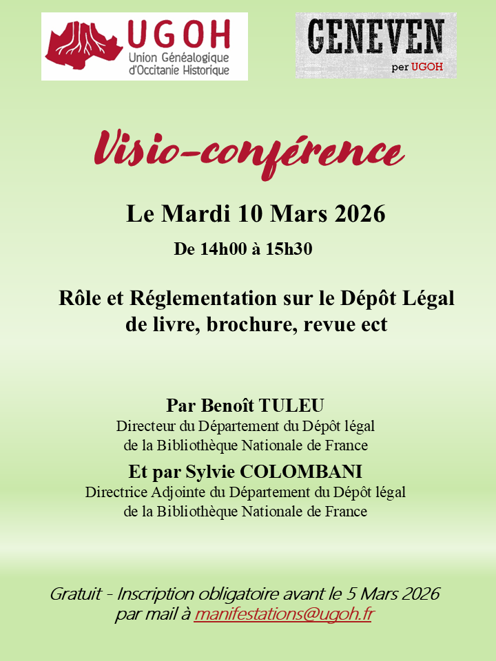 - 2025-2026, les nouveautés et les évolutionsLe Président de l’UGOH Mr Eric POCIELLO annonce les nouveautés qui seront mises en œuvre dès le 1er janvier 2026. Le Cercle Généalogique Héraultais et les Jeunes Généalogistes Occitans seront dissous le 31 décembre...