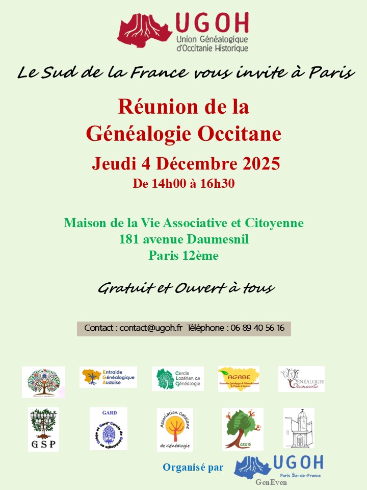 Une réunion de la généalogie occitane se tiendra jeudi 4 décembre 2025 de 14h à 16h30 dans le 12ᵉ arrondissement de Paris.