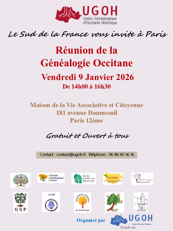 Une réunion de la généalogie occitane se tiendra vendredi 9 janvier de 14h à 16h30 dans le 12ᵉ arrondissement de Paris.